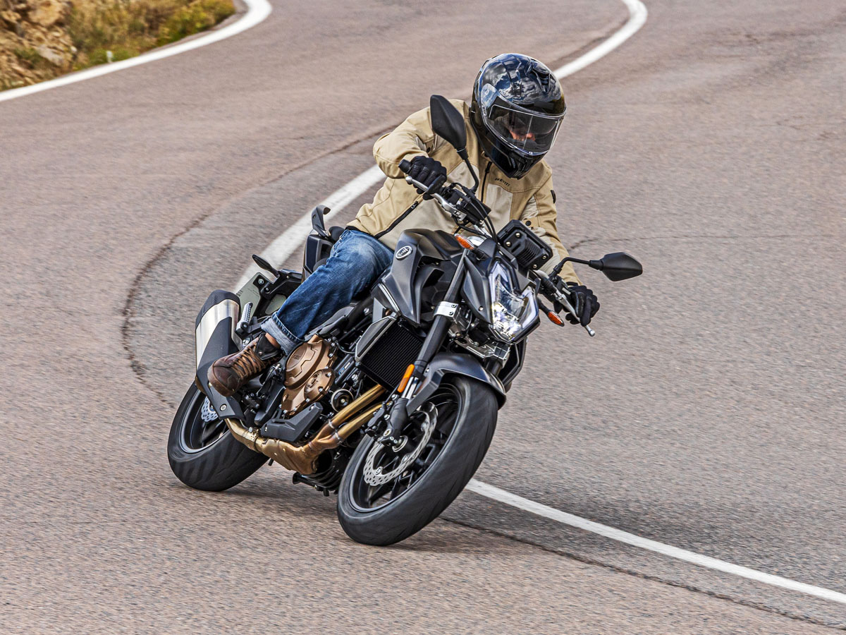 La moto dispose d’une suspension KYB de haute qualité, avec une fourche inversée à l’avant et un amortisseur arrière à biellettes, offrant une conduite réactive et stable, adaptée à différents types de routes.